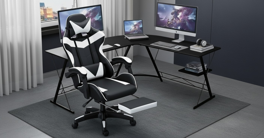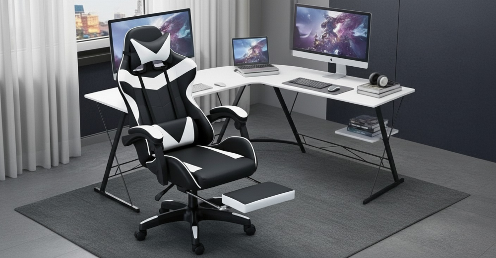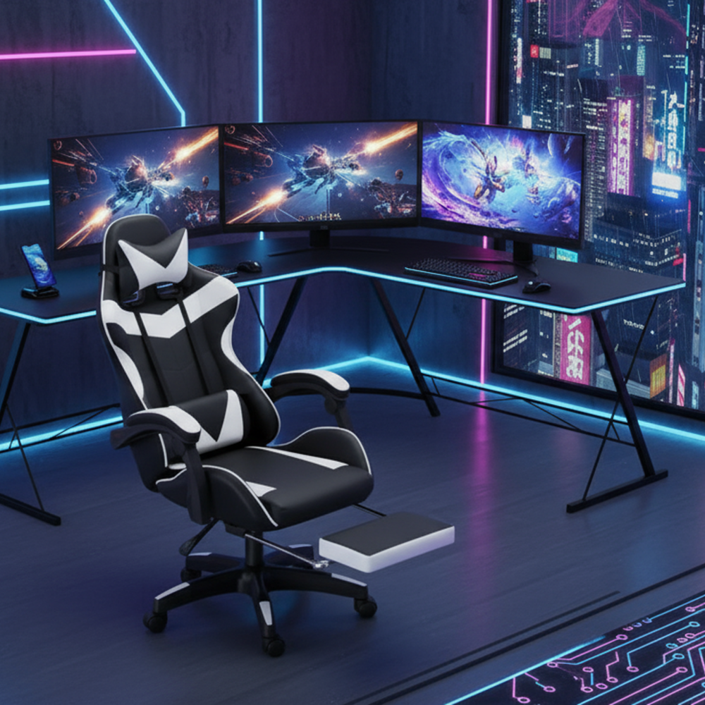 احصل على مساحة مثالية للعب أو العمل مع طاولة قيمنق زاوية أنيقة تأتي مع كرسي ألعاب مريح. التصميم الذكي يوفر استخدامًا أمثل للمساحة، بينما تضيف الألوان الأبيض والأسود لمسة عصرية تناسب مختلف الديكورات الداخلية.